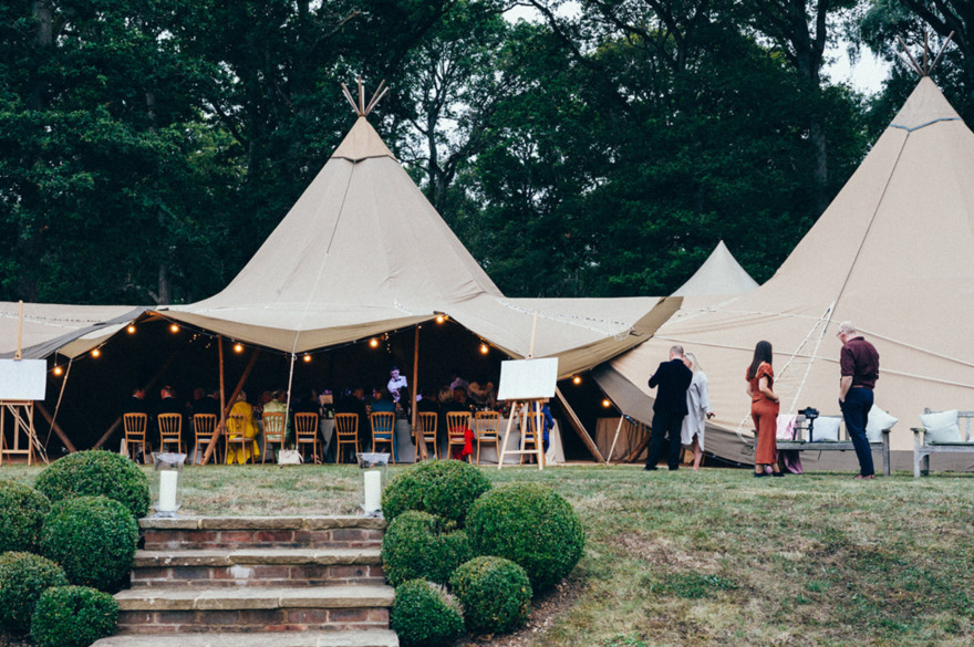 The wedding party arrived in sports cars, before joining their guests for the wedding ceremony under a woodland arch in the nearby woods. They had champagne and speeches on the lawn and then made their way into the giant tipis we had set up and decorated, bringing some of the woodland theme inside, for the wedding breakfast.